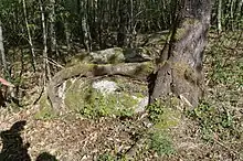 Dolmen en ruine avec sa table brisée d'environ 8 mètres de circonférence[28].