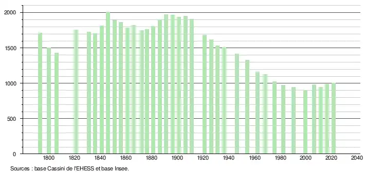 L'évolution du nombre d'habitants est connue à travers les recensements de la population effectués dans la commune depuis 1793. Pour les communes de moins de 10 000 habitants, une enquête de recensement portant sur toute la population est réalisée tous les cinq ans, les populations légales des années intermédiaires étant quant à elles estimées par interpolation ou extrapolation[20]. Pour la commune, le premier recensement exhaustif entrant dans le cadre du nouveau dispositif a été réalisé en 2006[21].