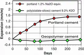 L'innocuité envers la réaction alcali-granulat est toujours confirmée dans les ciments géopolymères. Plus récemment, Li et al.[28] a utilisé une autre norme, la ASTM C 441-97, par laquelle la poudre de verre de quartz est l'élément réactif. La durée du test est de 90 jours. Les mortiers de ciment Portland présentent une expansion à 90 jours dans la gamme de 0,9 à 1,0 %, tandis que le ciment géopolymère est resté pratiquement inchangé, avec un retrait limité de -0,03 % à 90 jours.