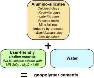 Pour fabriquer un ciment géopolymère on emploie un silicate d'alumine, un réactif alcalin inoffensif d'emploi (user-friendly)[2] (silicates solubles de sodium ou de potassium avec un rapport molaire SiO2:M2O > 1,65, M étant Na ou K) et de l'eau (voir la définition de réactif inoffensif user-friendly ci-dessous). C'est l'addition du cation calcium, essentiellement le laitier de haut fourneau, qui assure le durcissement à la température ambiante.