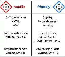 Le tableau dresse la liste des produits chimiques alcalins et leur étiquette de danger correspondante[8]. Les produits corrosifs doivent être manipulés avec des gants, des lunettes et des masques. Ils sont hostiles à l'utilisateur et ne peuvent pas être mis en œuvre dans des applications de masse sans respecter les procédures de sécurité appropriées. Dans la deuxième catégorie, on trouve le ciment Portland ou la chaux hydratée, produits typiques de masse. Les réactifs alcalins géopolymères appartenant à cette classe peuvent aussi être appelés inoffensifs (user-friendly).