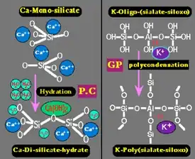 À droite : durcissement (prise) du ciment géopolymère (GP) par polycondensation d'oligo-(sialate-siloxo) de potassium en poly(sialate-siloxo) de potassium réticulé.