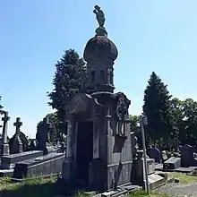 La porte en métal est surmontée d’un dôme outrepassé qui repose sur un tambour parsemé de lanternes. Au sommet du dôme, une gargouille ailée surplombe le cimetière, les mains liées, symbole mortuaire romantique. Sur le fronton repose une croix tréflée (aussi connue sous le nom de croix fleuronnée).