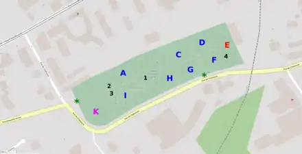 K : carré de l'Hospice ; E : partie ancienne ; C, D, F, G : nouveaux carrés ; A, I : annexes et jardin du souvenir.