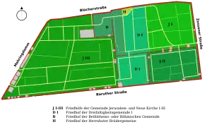 - Les cimetières I, II et III de Jérusalem et de la Nouvelle Église (Friedhöfe Jerusalem und Neue Kirche I, II, III) sont rattachés aux paroisses de l'église de Jérusalem et de la Nouvelle Église. Ils forment la plus grande partie de la zone funéraire. Le cimetière I fondé en 1735 se situe au nord-est sur une superficie de 10 457 m²[5], le cimetière II fondé dans les années 1750 au sud-est sur une superficie de 7 034 m²[5] et le cimetière III fondé en 1821 sur toute la partie ouest donnant sur Mehringdamm, sur une superficie de 28 719 m²[5].