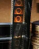 Une invention fondamentale arrive à point nommé, celle de l’Américain John Carbutt qui, en 1888, met sur le marché, fabriqué par les usines de George Eastman, un support souple en celluloïd, destiné à la photographie, débité en plaques et en rouleaux de 70 mm de large, enduits ou non de substance photosensible. La date de 1888 peut être ainsi considérée comme la fin du précinéma et le début du cinéma. À partir du ruban souple non perforé de Carbutt-Eastman, Edison et Dickson créent d'abord un format spécifique large de 19 mm. C'est un format aux photogrammes circulaires d’environ 13 mm de diamètre (survivance des jouets optiques) qui défilent à l'horizontal, entraînés par une seule rangée de perforations rectangulaires arrondies, disposées en bas des photogrammes, à raison de six perforations par image. Dickson et son assistant William Heise enregistrent sur ce support les premiers films du cinéma. « Les bandes tournées par Dickson sont à proprement parler les premiers films[10]. » Le mécanisme utilisé pour faire avancer la pellicule et l'arrêter derrière l'objectif pour impressionner une image, puis redémarrer pour s'arrêter aussitôt pour impressionner une autre image, est déjà connu du monde de la mécanique : la roue à rochet à avance électrique. C'est Edison qui a l'idée d'utiliser le mot anglais film, qui signifie « voile », « couche », pour désigner les bobineaux de pellicule impressionnés[11].