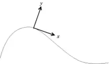 Pour simplifier les calculs, on définit souvent un repère local dit « de Frenet » pour chaque instant ; en un point de la courbe, l'axe des x est la tangente à la courbe et orienté dans le sens du mouvement, et l'axe des y est la normale à la courbe orienté de sorte que le repère soit direct[6]. Ce n'est pas un référentiel mobile par rapport au référentiel de l'étude, c'est un repère instantané, défini juste à un instant t pour simplifier l'écriture des grandeurs à cet instant donné. Le référentiel reste celui du laboratoire, seule change la manière dont on exprime les composantes des vecteurs.