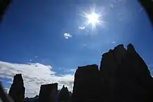 Vue des Cinque Torri depuis le col de Falzarego ; de droite à gauche : Torre Grande, Torre del Barancio, Torre Latina, Torre Quarta et Torre Quinta. | |
