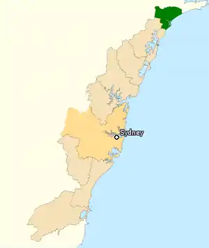 La circonscription de Newcastle (en vert) en Nouvelle-Galles du Sud.L'agglomération de Sydney est en beige.