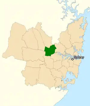 La circonscription de Parramatta (en vert) à l'ouest de Sydney (en beige) en Nouvelle-Galles du Sud.