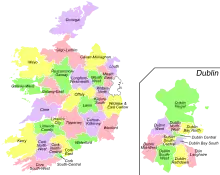 La chambre basse de l’Oireachtas, le Parlement irlandais, le Dáil Éireann, regroupe actuellement 158 Teachtaí Dála (TD), les députés, représentant les quarante circonscriptions électorales de l’État d’Irlande. En fonction de sa taille, chaque circonscription est représentée par au minimum trois députés et au maximum cinq, bien qu'il n'y ait officiellement pas de limite haute.