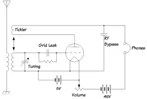 Schéma ; le feedback a été appliqué à l'entrée du tube d'un « enroulement de rappel » sur la bobine d'accordement