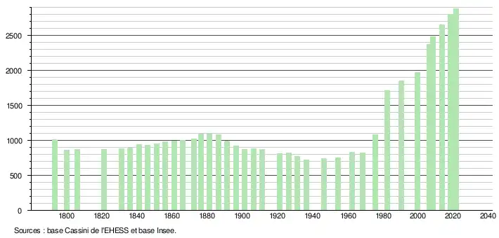 L'évolution du nombre d'habitants est connue à travers les recensements de la population effectués dans la commune depuis 1793. Pour les communes de moins de 10 000 habitants, une enquête de recensement portant sur toute la population est réalisée tous les cinq ans, les populations légales des années intermédiaires étant quant à elles estimées par interpolation ou extrapolation[31]. Pour la commune, le premier recensement exhaustif entrant dans le cadre du nouveau dispositif a été réalisé en 2008[32].