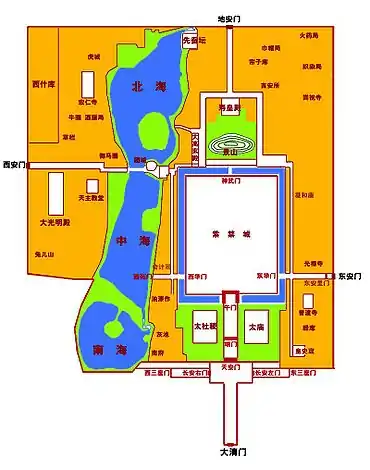 La Cité interdite se trouve au centre de la Cité impériale. À l'ouest, se trouvent les lacs Zhongnanhai et Beihai, qui étaient entourés des jardins impériaux, et généralement dénommés ensemble Parc occidental.