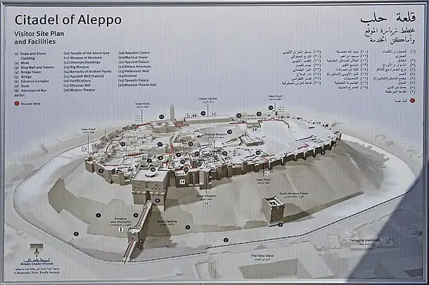 La citadelle d'Alep est un palais médiéval fortifié situé sur un tel dominant le centre-ville d'Alep et caractérisée par son imposante entrée fortifiée. Elle est le témoin d’une force militaire arabe du XIIe au XIVe siècle.