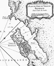 À partir de 704, l'île a été soumise aux incursions des Sarrasins. Le comte de Lucques Bonifacio[1] (mort après 838) participant à une expédition contre les Sarrasins installés en Corse à la demande de Lothaire Ier[2], roi d'Italie, est attiré par le site de Bonifacio et fait construire au nom du pape, en 830, un castrum à l'extrémité du plateau auquel il a donné son nom. Progressivement, des marchands utilisant le port de l'anse de la Cartola se sont installés à proximité.