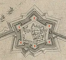 L'ensemble est entouré d'un chemin couvert avec places d'armes rentrantes vers le milieu des courtines. Par la suite des demi-lunes seront ajoutées devant les courtines 1-6, 3-4 et 5-6.