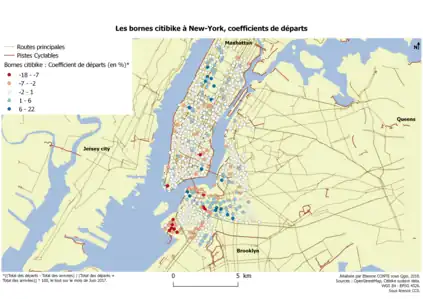 Cette carte représente les pourcentages de départs pour chaque borne citibike. Si ce pourcentage est positif, il y a un excédent de départs, s'il est négatif, il y a un excédent d'arrivées. Une concentration de bornes avec un coefficient de départs très faible (entre −18 % et −7 %) est visible à l'Ouest de Brooklyn. Cette concentration peut par exemple signifier qu'une zone résidentielle se trouve dans cet espace. Les pourcentages de départ positifs se trouvent globalement dans Manhattan. La grande majorité des bornes sont relativement équilibrées en départs et en arrivées, ce qui permet de voir plus facilement les bornes non équilibrés entre départs et arrivées.