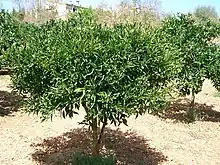 L'arbre généralement petit peut atteindre 8 m de hauteur[40], vigoureux et dense, souvent épineux. Les feuilles de tailles variables sont allongées, pointues, d'un vert brillant, avec un pétiole légèrement ailé.