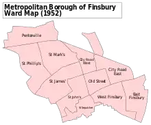 Depuis Angel, City Road passe à peu près au sud-est et descend au-delà du City Road Basin du Regent's Canal et de Moorfields Eye Hospital, après quoi il se rapproche du sud et est relié à Old Street par un grand rond-point. Après Old Street, elle continue vers le sud, passe devant le Cimetière de Bunhill Fields, la Chapelle Wesley et la Honourable Artillery Company, puis continue vers le sud en direction de Finsbury Square, puis de Finsbury Pavement, puis de Moorgate — cette dernière partie commençant à la frontière avec la ville de Londres. Ces routes constituent un point d’entrée majeur dans la Cité de Londres et ont été étendues en 1846 à travers la Cité elle-même (comme Princes Street et King William Street) pour rejoindre le Pont de Londres.