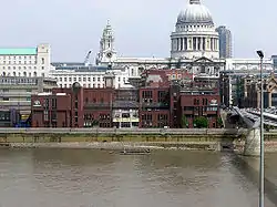 Vue sur la façade de briques rouges de la City of London School, sur les bords de la Tamise. La cathédrale Saint Paul est en arrière-plan. Le Millennium Bridge est du côté droit. Cette vue a été popularisée, notamment dans un film, en 2005 The Constant Gardener.