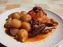 | Ingrédients | Morceaux de lièvre marinés dans du vin rouge, puis revenus dans de l'huile d'olive avec des oignons et une gousse d'ail. La cuisson se fait ensuite avec la marinade, une feuille de laurier, une branche de thym, du romarin, des clous de girofle, sel et poivre. Le sang est lié à la sauce en fin de cuisson. |