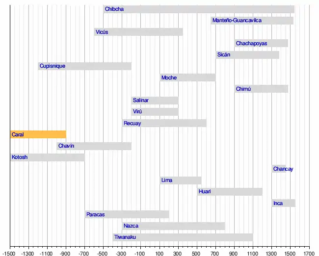 La civilisation de Caral a prospéré entre 3000 et 1800 av. J.-C., en même temps que la culture Valdivia, en Équateur. La société complexe de Caral émergea juste un millénaire après les sumériens et fut contemporaine des pyramides d'Egypte ; elle précéda les mésoaméricains Olmèques de près de deux millénaires.