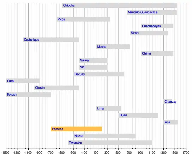 « Cette civilisation pratiquait le tissage (laine et coton) ainsi que la poterie. Elle pratiquait également une déformation cranienne par allongement dans un but esthétique, ainsi que la trépanation rituelle, parfois répétée. Après l'an 200, la civilisation de Paracas se fond dans celle de Nazca. »[réf. nécessaire] Elle est une des plus importantes cultures pré-incas du Pérou qui émergea après la disparition de la domination Chavín pendant la période de l'Horizon Ancien dans la région de Ica-Nazca. C'est l'archéologue Julio C. Tello qui en fait la découverte dans les années 1920 et qui, après l'analyse du style d'enterrement et des motifs qui ornent les fardos funéraires — ballots coniques formés de plusieurs épaisseurs de tissus dans lesquels on enveloppait les morts — trouvés dans les cimetières (comme celui de Wari Kayan) divise son occupation en deux périodes distinctes : Paracas Cavernas (VIIIe et IIIe siècles av. J.-C.) et Paracas Necropolis (IIIe siècle av. J.-C.-IIIe siècle).