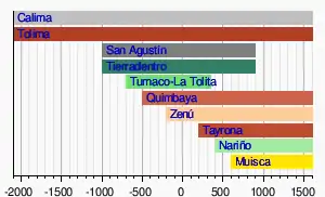 La culture Calima est le nom qu'ont donné les archéologues au groupe humain qui a peuplé les bassins des ríos San Juan, Dagua et Calima, dans le département de Valle del Cauca où il a vécu, selon les études, entre l'Holocène et le XVe siècle[26].