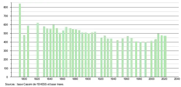 L'évolution du nombre d'habitants est connue à travers les recensements de la population effectués dans la commune depuis 1793. Pour les communes de moins de 10 000 habitants, une enquête de recensement portant sur toute la population est réalisée tous les cinq ans, les populations légales des années intermédiaires étant quant à elles estimées par interpolation ou extrapolation[27]. Pour la commune, le premier recensement exhaustif entrant dans le cadre du nouveau dispositif a été réalisé en 2005[28].