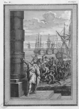 - Bibliothèque Huntington, San Marino (Californie), Robinson Crusoe et Vendredi (Les voyages imaginaires), gravé par Rémi Delvaux d'après Clément-Pierre Marillier.
