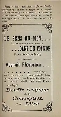 Début 1921, Pansaers fait partie des signataires du tract « Dada soulève tout »[14], rédigé à l'occasion de et contre la conférence sur le « tactilisme » donnée par le poète futuriste italien Filipo Marinetti au Théâtre de l'Œuvre à Paris, les dadaïstes tenant à se démarquer du futurisme italien aux yeux du public.