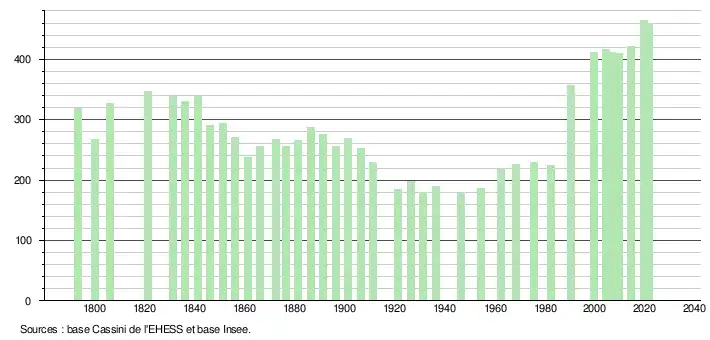 L'évolution du nombre d'habitants est connue à travers les recensements de la population effectués dans la commune depuis 1793. Pour les communes de moins de 10 000 habitants, une enquête de recensement portant sur toute la population est réalisée tous les cinq ans, les populations légales des années intermédiaires étant quant à elles estimées par interpolation ou extrapolation[20]. Pour la commune, le premier recensement exhaustif entrant dans le cadre du nouveau dispositif a été réalisé en 2004[21].