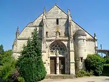 - De cet édifice de style gothique, provient l'ensemble très homogène du chœur au chevet plat, du transept et du clocher en bâtière. Portant tous les trois sur une travée et terminés par une façade avec pignon identique, les deux croisillons du transept et le chœur flanquent le clocher qui s'élève au-dessus de la croisée du transept. Son unique étage d'une hauteur importante est percé sur chaque face de deux grandes ouvertures en tiers-point, flanquées par des colonnettes à chapiteaux et entourées d'un tore, et s'inscrivant dans des archivoltes selon les mêmes dispositions.