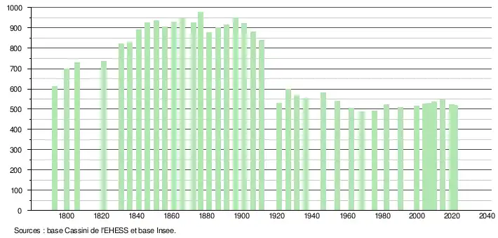 L'évolution du nombre d'habitants est connue à travers les recensements de la population effectués dans la commune depuis 1793. Pour les communes de moins de 10 000 habitants, une enquête de recensement portant sur toute la population est réalisée tous les cinq ans, les populations légales des années intermédiaires étant quant à elles estimées par interpolation ou extrapolation[23]. Pour la commune, le premier recensement exhaustif entrant dans le cadre du nouveau dispositif a été réalisé en 2004[24].