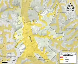 Le retrait-gonflement des sols argileux est susceptible d'engendrer des dommages importants aux bâtiments en cas d’alternance de périodes de sécheresse et de pluie. 44,3 % de la superficie communale est en aléa moyen ou fort (33,6 % au niveau départemental et 48,5 % au niveau national). Sur les 140 bâtiments dénombrés sur la commune en 2019, 83 sont en aléa moyen ou fort, soit 59 %, à comparer aux 25 % au niveau départemental et 54 % au niveau national. Une cartographie de l'exposition du territoire national au retrait gonflement des sols argileux est disponible sur le site du BRGM[17],[Carte 2].