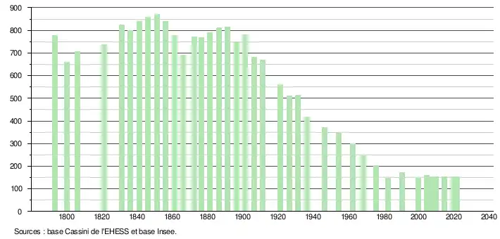 L'évolution du nombre d'habitants est connue à travers les recensements de la population effectués dans la commune depuis 1793. Pour les communes de moins de 10 000 habitants, une enquête de recensement portant sur toute la population est réalisée tous les cinq ans, les populations légales des années intermédiaires étant quant à elles estimées par interpolation ou extrapolation[23]. Pour la commune, le premier recensement exhaustif entrant dans le cadre du nouveau dispositif a été réalisé en 2004[24].