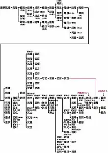 Chikanori ┃ Masanori ┃ (1) Kikuchi Noritaka ┣━━━━━━━━━━━━━━━━━━━━━━━━━━━━━━━━━━━━┳━━━━━━━━━━━━━━━━━━━━━━━━━━━┓ (2) Tsunetaka (clan Hyodo -) Yoritaka (clan Kojima -) Masataka (clan Saigo, 西郷氏) ┃ (3) Tsuneyori ┃ (4) Tsunemune ┃ (5) Tsunenao ┣━━━━━━━━━━━━━━━━━━━━━━━━━━━━━━━━━━━━━━━━━┓ (6) Takanao (clan Akahoshi, 赤星氏) ┃ (7) Takatada ┃ Takatsugu ┃ (8) Yoshitaka ┣━━━━━━━━━━━━┳━━━━━━━━━━━━┳━━━━━━━━━━━━━━━━━━━━━━━━━━━━━━━━━━━━┓ (9) Takayasu Takatsune (clan Jô, 城氏) Takayori (clan Jô, 城氏) ┣━━━━━━━━━━━━┳━━━━━━━━━━━━┳━━━━━━━━━━━━━━━━━━━━━┳━━━━━━━━━━━━━━━━━━━━━━━━━━━━━┳━━━━━━━━━━━━━━━━━┳━━━━━━━━┳━━━━━━━━┓ (10) Takefusa Naotaka Yoritaka Aritaka (clan Akahoshi, 赤星氏) (clan Wakamiya) Takafuyu Yasunari Shigemune ┣━━━━━━━━━━━━┳━━━━━━━━━━━━┳━━━━━━━━━━━┳━━━━━━━━━━━┳━━━━━━━━━━━━┳━━━━━━━━━━┓ Takamori Michitake Takemoto Takenari Taketsune Takekado Takemura ┣━━━━━━━━━━━━┓ (11) Tokitaka (12) Taketoki ┣━━━━━━━━━┳━━━━━━━━┳━━━━━━┳━━━━━━━━┳━━━━━━━━┳━━━━━━┳━━━━━━━━━┳━━━━━━━━━━━┳━━━━━━━━━━━┳━━━━━━━━━━┳━━━━━━━━━━━━┳━━━━━━━┳━━━━━━┓ (13) Takeshige Yoritaka (14) Takehito Takeyoshi Taketoshi (15) Takemitsu Takezumi Takenao (clan Takase -) Taketoyo ┃ ┃ ┃ (16) Takemasa Takemoto Takekuni ┃ ┃ ┃ (17) Taketomo Moritake Takenaga (adopté par le clan, 林氏) ┃ ┃ ┃ (18) Kanetomo Yasuharu Hayashi Narinaga[11]. ┃ ┃ (19 )Mochitomo Takeyasu ┃ ┃ (20) Tamekuni (25) Takekane ┣━━━━━━━━┳━━━━━━━┓ (21) Shigetomo 武邦 重安 ┃ ┃ (22) Yoshiyuki (23) Masataka ┃┃ (24) Taketsune (adopté par le clan Asa, 阿蘇氏) ┃┃ (25) Takekane (from Takezumi line[Traduire passage]) ┃┃ (26) Yoshitake (Ōtomo Shigeharu, 大友氏)[10]