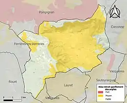 Le retrait-gonflement des sols argileux est susceptible d'engendrer des dommages importants aux bâtiments en cas d’alternance de périodes de sécheresse et de pluie. 63,1 % de la superficie communale est en aléa moyen ou fort (59,3 % au niveau départemental et 48,5 % au niveau national). Sur les 701 bâtiments dénombrés sur la commune en 2019, 692 sont en aléa moyen ou fort, soit 99 %, à comparer aux 85 % au niveau départemental et 54 % au niveau national. Une cartographie de l'exposition du territoire national au retrait gonflement des sols argileux est disponible sur le site du BRGM[18],[Carte 2].