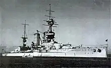 L'Almirante Latorre fut lancé le 27 novembre 1913[36],[37][N 7] lors d'une cérémonie à laquelle participèrent divers dignitaires et qui fut présidée par l'ambassadeur chilien au Royaume-Uni, Agustin Edwards. Le navire fut baptisé par l'épouse de l'ambassadeur, Olga Budge de Edwards[16] et pesait 10 900 t à ce moment[38]. Après le déclenchement de la Première Guerre mondiale en Europe, les travaux sur l'Almirante Latorre s'arrêtèrent en aout 1914[28] et le cuirassé fut officiellement acheté le 9 septembre quatre jours après que le cabinet britannique l'eut recommandé[17],[25],[39],[40]. L'Almirante Latorre ne fut pas saisi de force comme les navires Reshadieh et Sultan Osman I (ex-Rio de Janeiro) construits pour l'Empire ottoman du fait du statut de "neutralité amie" dont jouissait le Chili en Grande-Bretagne[25]. L'ancien navire chilien fut complété le 30 septembre 1915[17] et fut mis en service au sein de la Royal Navy le 15 octobre[36]. La construction de l'autre navire, l'Almirante Cochrane fut arrêtée après le début des hostilités. Les Britanniques le rachetèrent le 28 février 1918 pour en faire un porte-avions car le navire non complété était la seule coque suffisamment grande et rapide pouvant accueillir un pont à être disponible. La faible priorité du projet et les grèves dans les chantiers navals ralentirent la construction du navire[41].