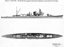 Le croiseur Furutaka, et le Kinugasa (de la classe Aoba), à l'arrière-plan, en 1941 | ||||||||