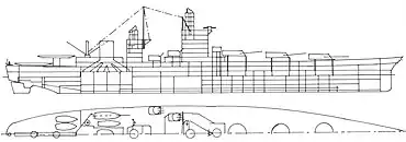 ![]() Le « F » était une tentative pour créer un hybride entre un porte-avion et un cuirassé. Son déplacement de 32 260 tonnes était largement inférieur aux dispositions du traité. Trois catapultes étaient montées à la proue avec un hangar capable d'accueillir dix bombardiers avec ailes repliables. Deux tourelles équipées de canons de 14 pouces non superposées étaient placées à l'arrière[32]. |