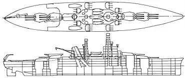 | Blindage | Ceinture : 168-305 mm[3]Kiosque : 178-406 mm[3] Barbettes : 292-406 mm[3] Tourelles : 178-406 mm[3] Ponts : 180-196 mm[3] |