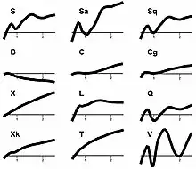 - Notation complémentaire indiquant que l'objet possède un gradient spectral (slope) élevé, propriété généralement attribuée à un possible phénomène d'érosion spatiale (weathering) (ex Sw, Sqw, Srw, Vw).