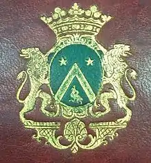 Il portait : D'azur au chevron d'or, accompagné en chef de deux étoiles et en pointe d'un faucon longé et chaperonné, le tout du même [7].
