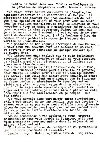 - Victor Pierre, « Extrait des registres du département de la Haute-Saône : Claude-François Galmiche, Prêtre déporté » (consulté le )