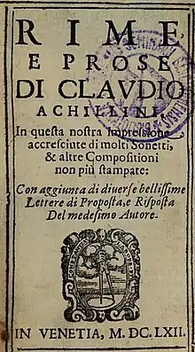 Claudio Achillini, né le à Bologne où il est mort le , est un juriste et écrivain italien parmi les poètes marinistes les plus notables. Il fut alors fort admiré en France ; Scudéry, Voiture et Balzac imitèrent son style précieux et recherché[1].