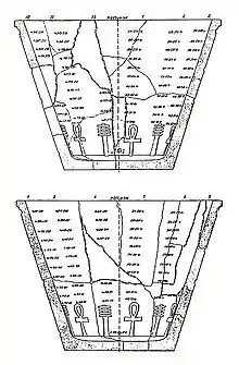 La paroi extérieure comporte une description astronomique et mythologique du ciel nocturne égyptien tandis que la paroi intérieure est gravée de signes de mesure.