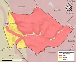 La commune est vulnérable au risque de mouvements de terrains constitué principalement du retrait-gonflement des sols argileux[34]. Cet aléa est susceptible d'engendrer des dommages importants aux bâtiments en cas d’alternance de périodes de sécheresse et de pluie. 98,5 % de la superficie communale est en aléa moyen ou fort (88,8 % au niveau départemental et 48,5 % au niveau national). Sur les 201 bâtiments dénombrés sur la commune en 2019, 201 sont en aléa moyen ou fort, soit 100 %, à comparer aux 98 % au niveau départemental et 54 % au niveau national. Une cartographie de l'exposition du territoire national au retrait gonflement des sols argileux est disponible sur le site du BRGM[35],[Carte 3].