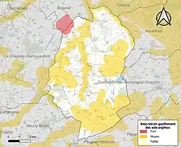 Les mouvements de terrains susceptibles de se produire sur la commune sont des tassements différentiels[17]. Le retrait-gonflement des sols argileux est susceptible d'engendrer des dommages importants aux bâtiments en cas d'alternance de périodes de sécheresse et de pluie[18]. 47,5 % de la superficie communale est en aléa moyen ou fort (54,9 % au niveau départemental et 48,5 % au niveau national)[Carte 2]. Depuis le , en application de la loi ELAN, différentes contraintes s'imposent aux vendeurs, maîtres d'ouvrages ou constructeurs de biens situés dans une zone classée en aléa moyen ou fort[Note 6],[19].
